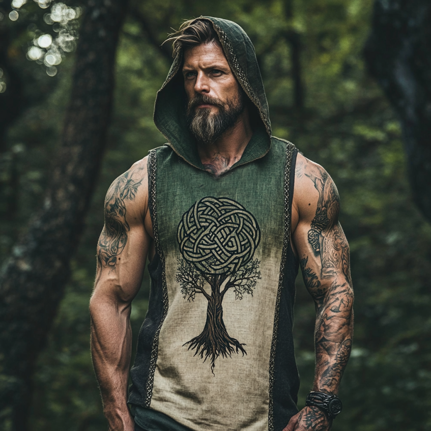 Men's Viking Celtic Knot Contrast Color Gradient Art Cozy Linen Hooded Vest