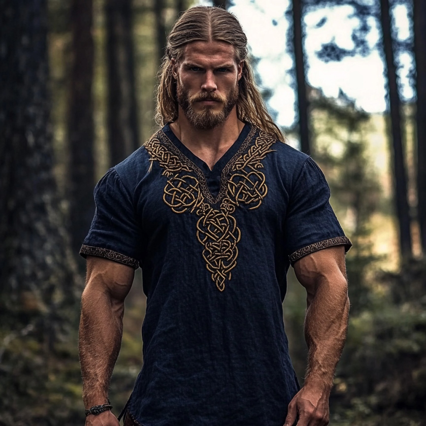 Men's Vintage Viking Celtic Knot Embroidered Linen T-shirt